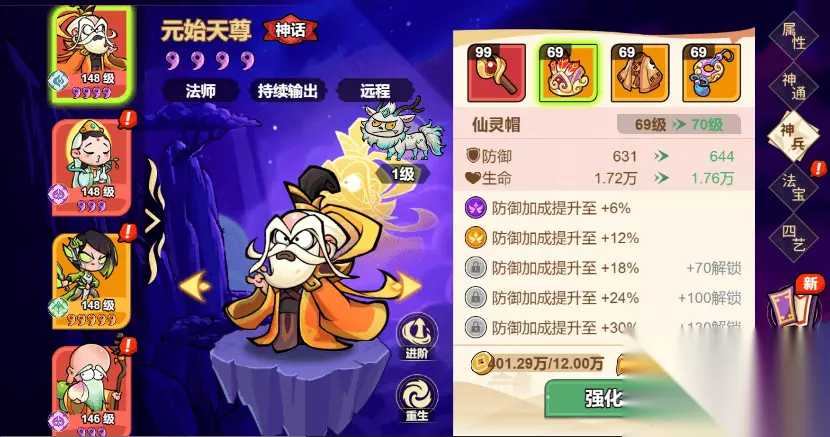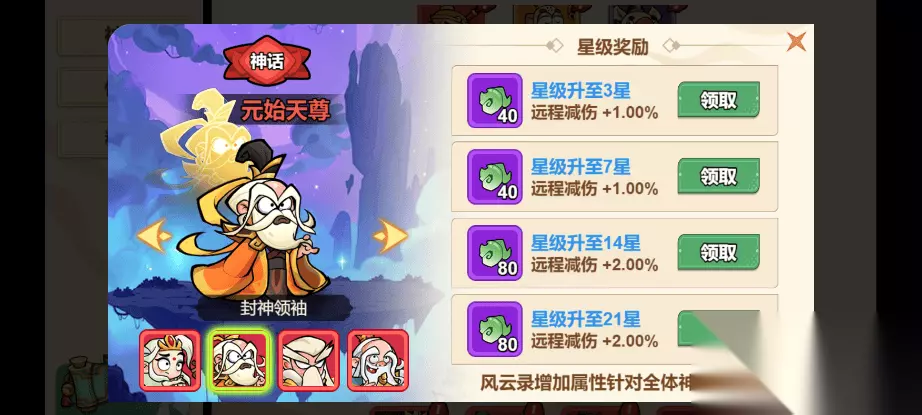 风云录:女娲+元始天尊+通天教主+姜子牙 神将升星后可提升全体神将的物理抗性+远程减伤+远程增伤+魔法抗性