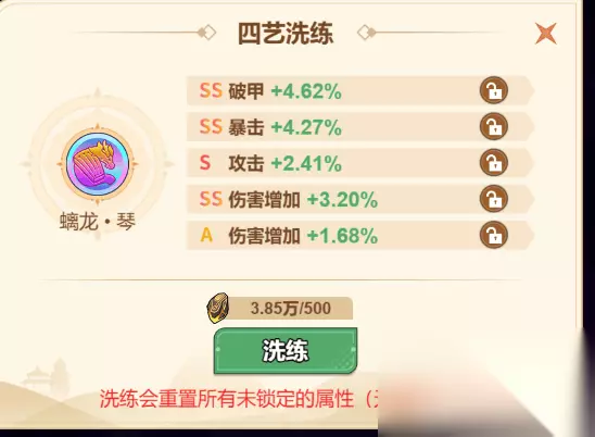 四艺属性洗炼:琴:优先选择暴击,攻击,魔法增伤。另外棋,书,画,选择,减伤,攻击回能,免控率。