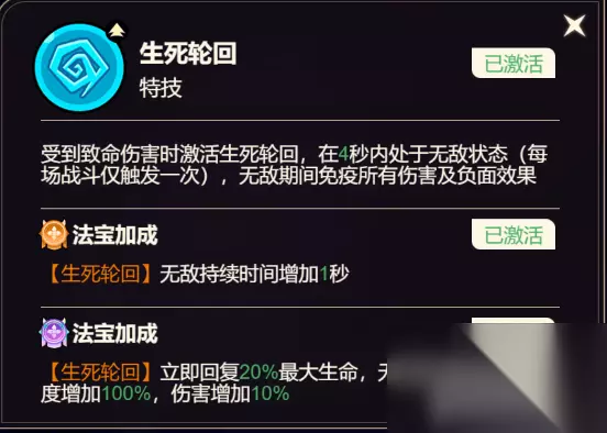 生死轮回: 受到致命伤害时激活生死轮回,在4秒内处于无敌状态(每场战斗仅触发一次),无敌期间免疫所有伤害及负面效果