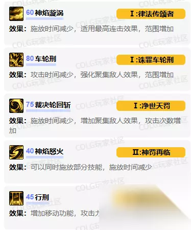 图:完整加点路线图 二、技能进化详解 40级【神焰怒火】→ 神罚再临 效果:可同时使用【审判重击】和【神焰疾降】 优化:施放时间减少,技能连贯性提升 45级【行刑】→ 炎狱执行官 效果:向前移动攻击 优化:冷却时间缩短至67.5秒,攻击力提升 60级【神焰漩涡】→ 律法传颂者 效果:可移动施放 优化:最大连击标准发动,攻击范围扩大 75级【裁决轮回斩】→ 净世天罚 效果:固定空中施放动作 优化:命中后聚集敌人并造成10次多段攻击 80级【车轮刑】→ 诛罪车轮刑 效果:车轮速度提升 优化:可控制霸体敌人,攻击范围扩大 三、技能强化建议 1️⃣ 神焰漩涡 强化重点:技能伤害提升 2️⃣ 裁决轮回斩 强化重点:技能伤害提升 3️⃣ 车轮刑 强化重点:技能伤害提升