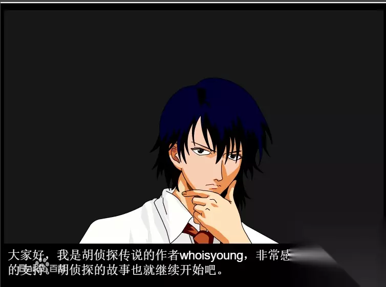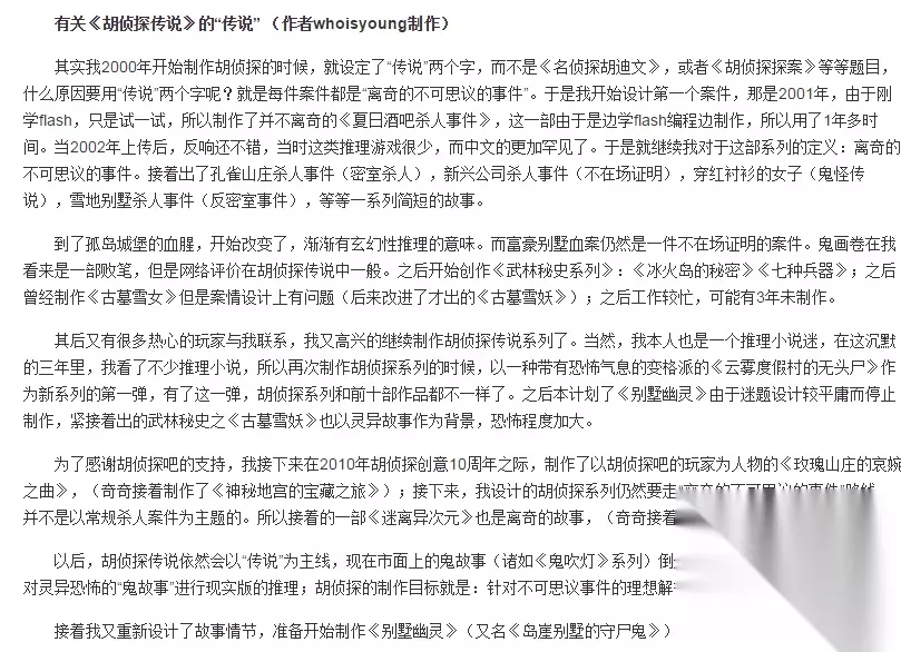 第十一回开始,不仅加入了侦探死亡元素,还完全消除了游戏中自带的“通关攻略”。 第一回到第十回,游戏中有自带攻略,一个真正想要参与破案的推理游戏迷是不会去查看攻略,按照攻略过关的,这样失去了推理游戏的乐趣。 所以到十一回开始,《胡侦探传说》才能完全算得上是一款推理游戏。 怎么评价《胡侦探传说》这款游戏呢? 你如果让我从一个游戏迷的角度来说,这款游戏评分不会很高; 因为做游戏并不是这个作者的本职工作,这充其量是他的一个兴趣爱好; 在很多胡侦探的粉丝鼓励之下,作者才能坚持创作到今天。