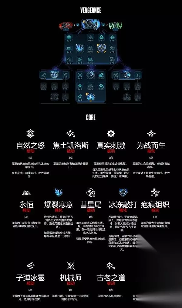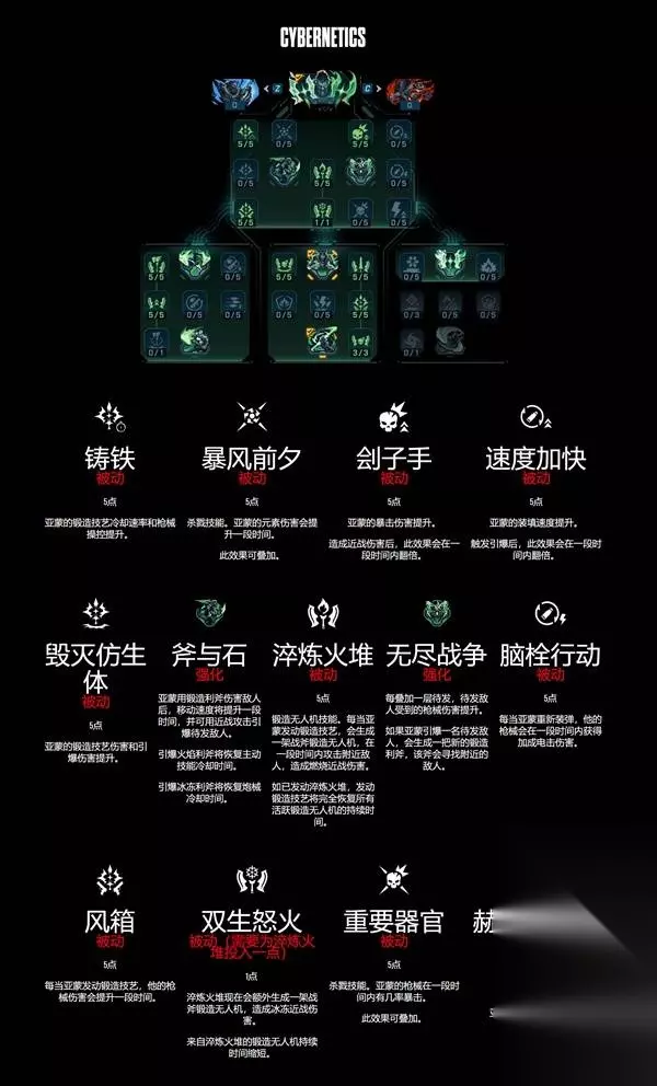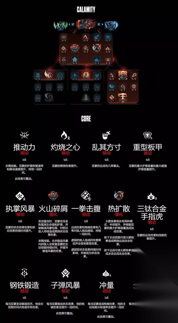 《无主之地4》中的锻造骑士亚蒙作为可灵活调整的肉盾,可使用武装无人机应对各种局面。下面为大家带来《无主之地4》锻造骑士亚蒙技能树一览,一起来看看吧。 锻造骑士秘藏猎人特质——锻造技艺 :亚蒙根据装备的主动技能获得锻造技艺,锻造技艺可通过按住主动技能发动。 锻造骑士主动技能: ·猛攻(灾祸技能树):亚蒙使自己的锻造铁拳过载,获得持续护盾恢复、枪械加成燃烧伤害,并提升移动速度。按下主动技能或近战发动火箭铁拳,前冲至目标敌人,并在近距离锥形范围内造成燃烧近战攻击伤害,同时使敌人蹒跚。Boss敌人不可蹒跚,恶棍敌人有几率蹒跚。 ·鞭笞(复仇怒火技能树):亚蒙装备锻造盾牌吸收所有正面伤害,并转化为复仇怒火。当复仇怒火条全满时,锻造盾牌则会提供伤害减免。如一段时间内未获得复仇怒火,其会迅速消耗。按下主动技能发射锻造波涛,对穿过的敌人造成冰冻炮械伤害,并会消耗复仇怒火提升造成的伤害。 ·严酷熔炉(神经机械技能树):亚蒙装备锻造利斧,可进行投掷并能从地面拾取以返还冷却时间。可投掷火焰利斧,造成燃烧近战伤害,也可投掷冰霜利斧,造成冰冻近战伤害。被锻造利斧伤害的敌人会在一段时间内陷入待发状态,当其死亡或被锻造技艺伤害时将引爆,对附近敌人造成伤害。