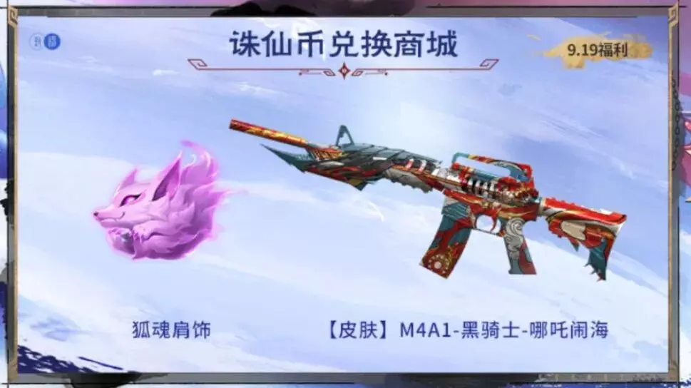 在诛仙币兑换商城中还可以兑换到CF端游经典复刻枪皮M4A1-黑骑士-哪吒闹海,以及颇有意思的版本主题肩饰狐魂肩饰!