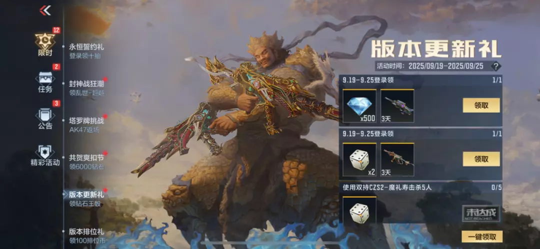 版本更新后登录即可领取500钻、王者之骰x2,攒起来总会有用武之地的。另外,在版本更新礼活动中还可以领取到FN-F2000-十绝阵觉醒(3天)和双持CZS2-魔礼寿(3天),一起来体验新武器!使用双持CZS2-魔礼寿击杀5人还能再领取1个王者之骰~
