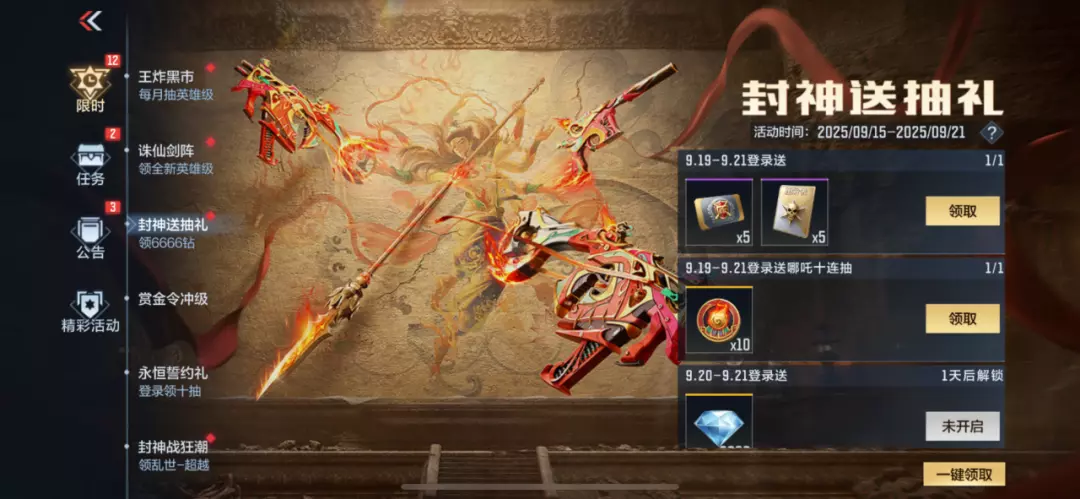 哪吒送抽礼活动早已上线,9月19日版本更新后解锁领取,登录即可领哪吒夺宝十连抽+6666钻石哦~