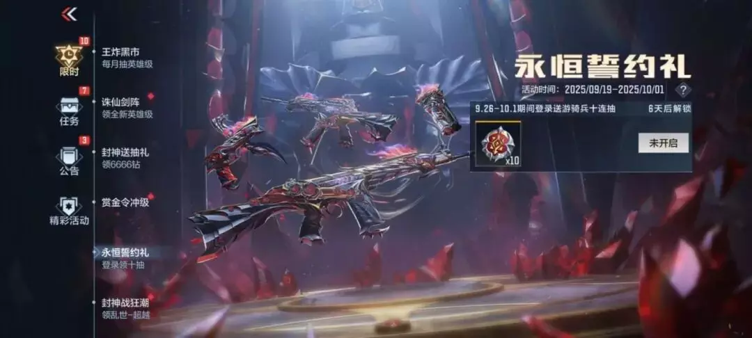 永恒誓约夺宝活动将在9月26日上线,全新武器G3A3-游骑兵将在这个活动中与大家见面,还可以从中抽取游骑兵全系列永恒誓约皮肤,当然也少不了游骑兵系列武器返场。目前游戏内上线了永恒誓约礼活动,在9月26日至10月1日期间登录游戏即可领取永恒誓约夺宝币x10,各位CFer记得留意活动哦~