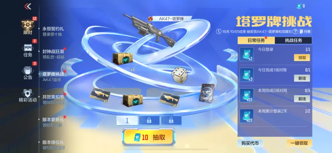 AK47-塔罗牌返场,仅需完成简单的活动任务即可获得活动专属抽奖币,完成三轮活动抽奖后可以将AK47-塔罗牌觉醒为AK47-塔罗牌觉醒,还未获取该武器的玩家可别错过~奖池中还有不少王者之骰、钻石等资源道具!
