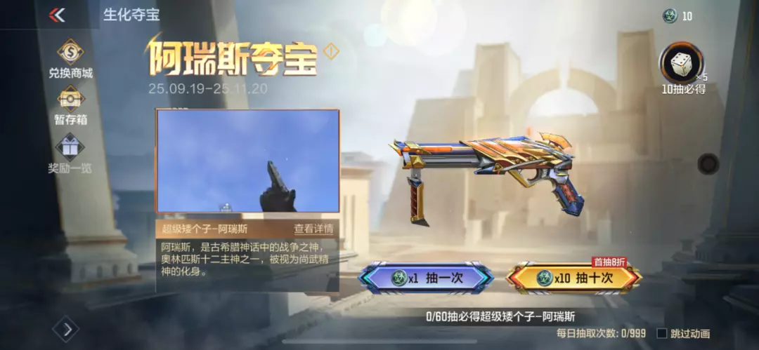 以古希腊神话战争之神为灵感的“阿瑞斯”系列生化武器来袭。阿瑞斯生化夺宝将会带来“阿瑞斯”套装,其中包括超级矮个子-阿瑞斯、MAC-10-阿瑞斯、烈焰长矛。