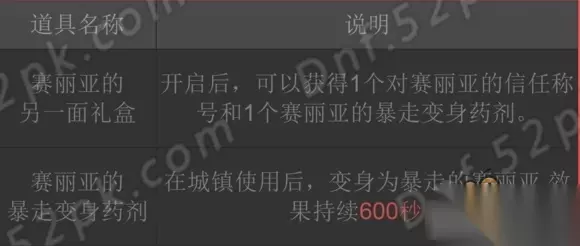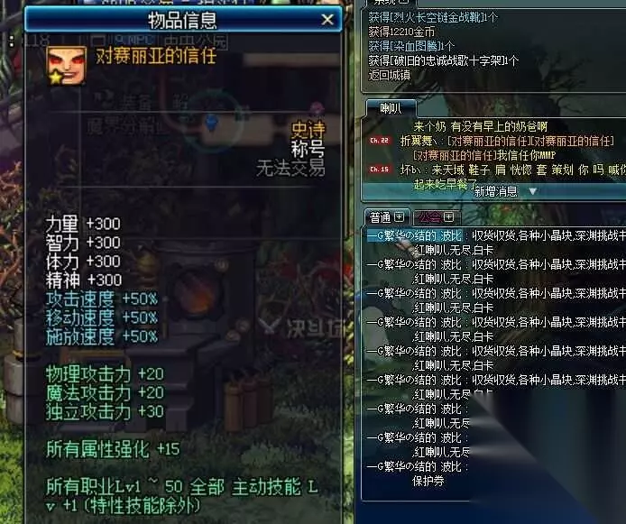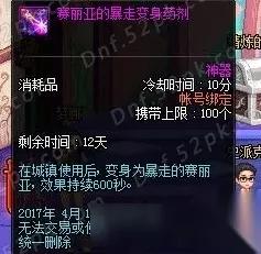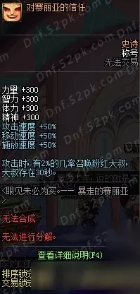 赛丽亚的暴走变身药剂效果 DNF对赛丽亚的信任称号属性 表面上看四维+300,三速+50%。但是!!!!!!这个称号你站街有加成效果,但是进图是没有属性加成的!