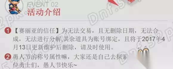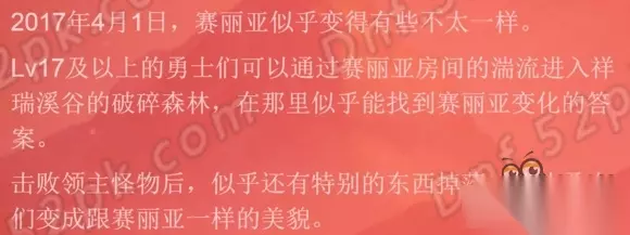 DNF对赛丽亚的信任称号获取方法由233乐园小编为大家带来。想知道DNF对赛丽亚的信任称号怎么获得吗?DNF对赛丽亚的信任称号属性又是怎么样的呢?快随小编一起来看看吧! DNF对赛丽亚的信任称号是2017年暴走的赛丽亚活动奖励,下面也为大家详细介绍一下这个活动的具体玩法和相关奖励内容吧。 在2017年4月1日~4月2日期间进入祥瑞溪谷(就是之前光头之路那个地图)并击杀BOSS可获得赛丽亚的另一面礼盒,打开后可以获得对赛丽亚的信任称号和暴走赛丽亚变身药剂。