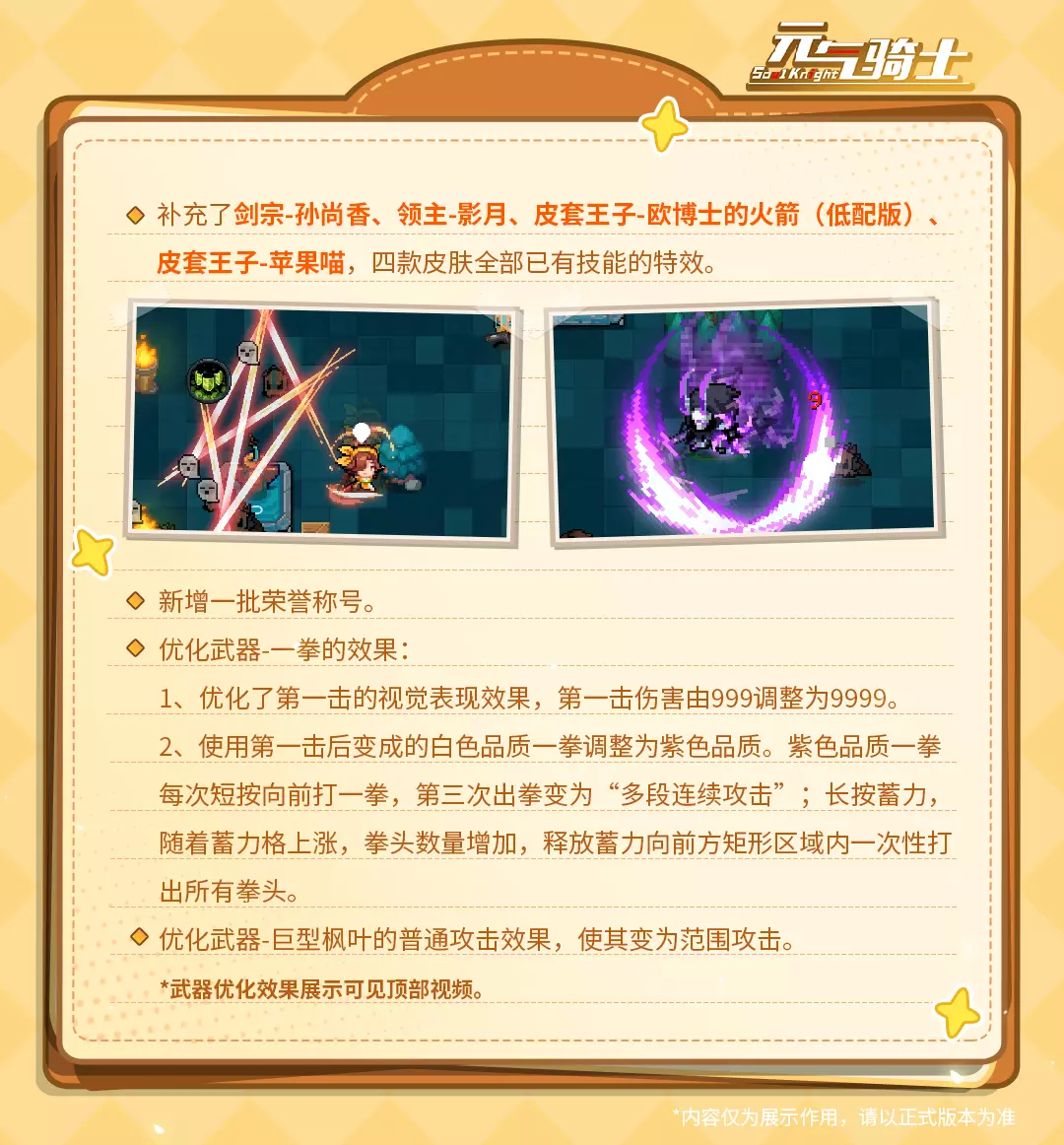 《元气骑士》7.6.0版本还更新了部分武器进化效果与武器皮肤,详情见下!