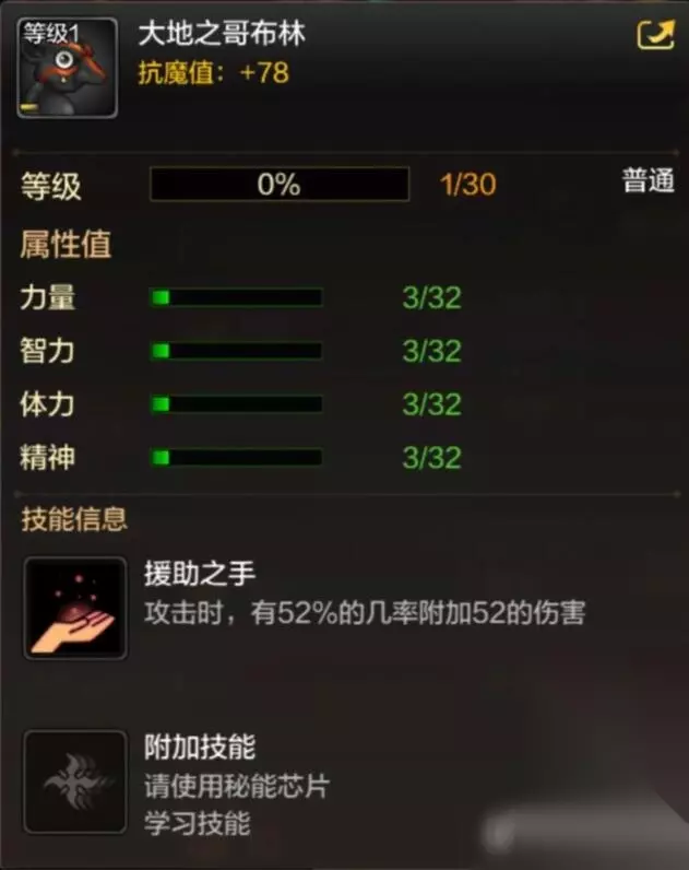 t15_2-t15_1:4.0 标签: 哥布林 DNF手游中有多种宠物供玩家选择,其中大地之哥布林是一种普通品质的宠物,可以增加78抗魔值,技能是援助之手,效果是攻击时,有52%几率附加52的伤害。