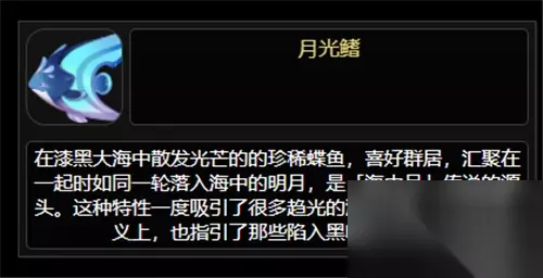 首先所谓的特殊的鱼,就是神秘摆设鱼【月光鳍】,这条鱼要发现【海中月】的真相后,才能去指定水域用【荧草饵】钓出来。(PS:海中月的真相要等到9月15日才能发现,也就是说月光鳍要等到9月15日才能钓。)