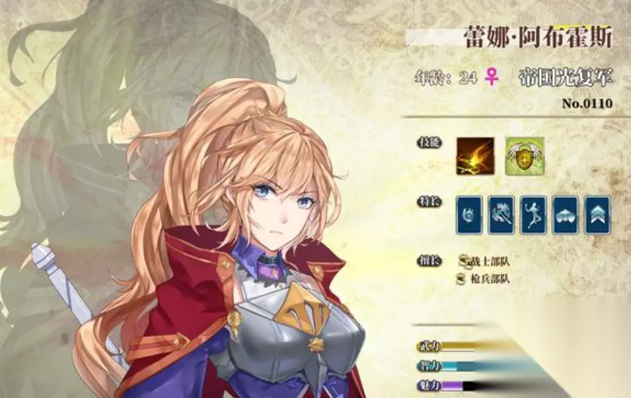 第三个是马尔库斯•费列克斯,他是一个27岁的大男孩,身穿铠甲,手拿长剑,他的强度也是极其的高,最擅长的就是战争,所有的擅长技能都与战争有关,要是还可以给她搭配一个最强的武士部队的话,基本上他就可以在伊格利亚大陆上任意穿梭,是整个大陆上打遍天下无敌手的存在。但是由于该角色的所有属性都是与战斗有关的,其他属性近似于没有,由此要是作为战争方面考虑的话,他肯定是最强的存在,但是如果做其他方面来的话,可能局限性比较大。