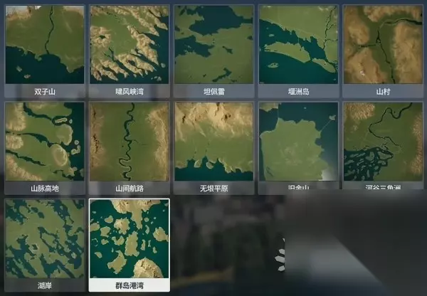难度评级:专家 该地图由群岛组成,其中包括环礁、澙湖和半岛。一条横穿地图的公路将较大的岛屿连接起来,同时也提供通往外界的道路。可建造区域被分割成了几块土地,其地理位置适合海陆空各种交通方式。 群岛港湾的上手难度比较高,只有16%的可建造面积,此外虽然与外界有连接运输线路,但铁路与开局可建造区域的距离非常远。 此地图中有许多群岛可以连接,大概可以创造出类似意大利风格或克罗地亚风格的城市,从视觉上看极具吸引力。可以说是目前所有可选地图中最具创意的地图,但相对来说上手难度也非常高。初始的可建造区域相对比较广阔,但两侧紧挨着的巨大山脉和岛屿也是面临的难题之一。 预计需要用大量的道路枢纽连接所有区域,不过依然会带来不小的交通问题。从另一个角度看此地图会比较容易将工业区和住宅区分开。