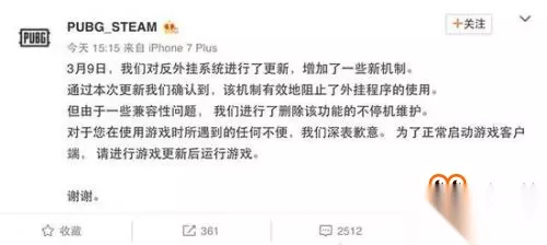 然而这款新的反作弊系统不仅没有取得好的效果,还导致游戏的兼容性出现了问题,导致游戏出现卡顿的现象,对此绝地求生官方进行了紧急的维护更新,直接将新的反作弊系统换回旧版,并进行了例行的道歉。