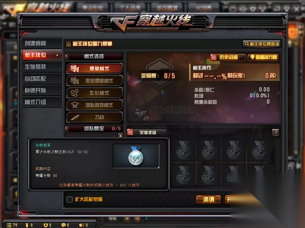 (温馨提示:目前共有8款荣耀勋章,每一种荣誉勋章都有属于自己的名字,难易度分为三个档次:金色,白色,铜色,金色最难,白色中等,铜色最简单,1金,4白,3铜,合计8款) 战场英雄:获得所有的荣誉勋章(0/7)奖励内容:荣誉分数120,如果达到最高荣耀分数时奖励火线币-1000火线币 排位赛达人:累计排位次数达到80次(0/80)奖励内容:荣誉分数90,如果达到最高荣耀分数时奖励火线币-400火线币 击杀冠军:累计杀敌次数达到30次(0/30)奖励内容:荣誉分数80,如果达到最高荣誉分数时奖励火线币-400火线币 排位赛模范生:累计排位次数达到30次(0/30)奖励内容:荣誉分数80,如果达到最高荣誉分数时奖励火线币-400火线币