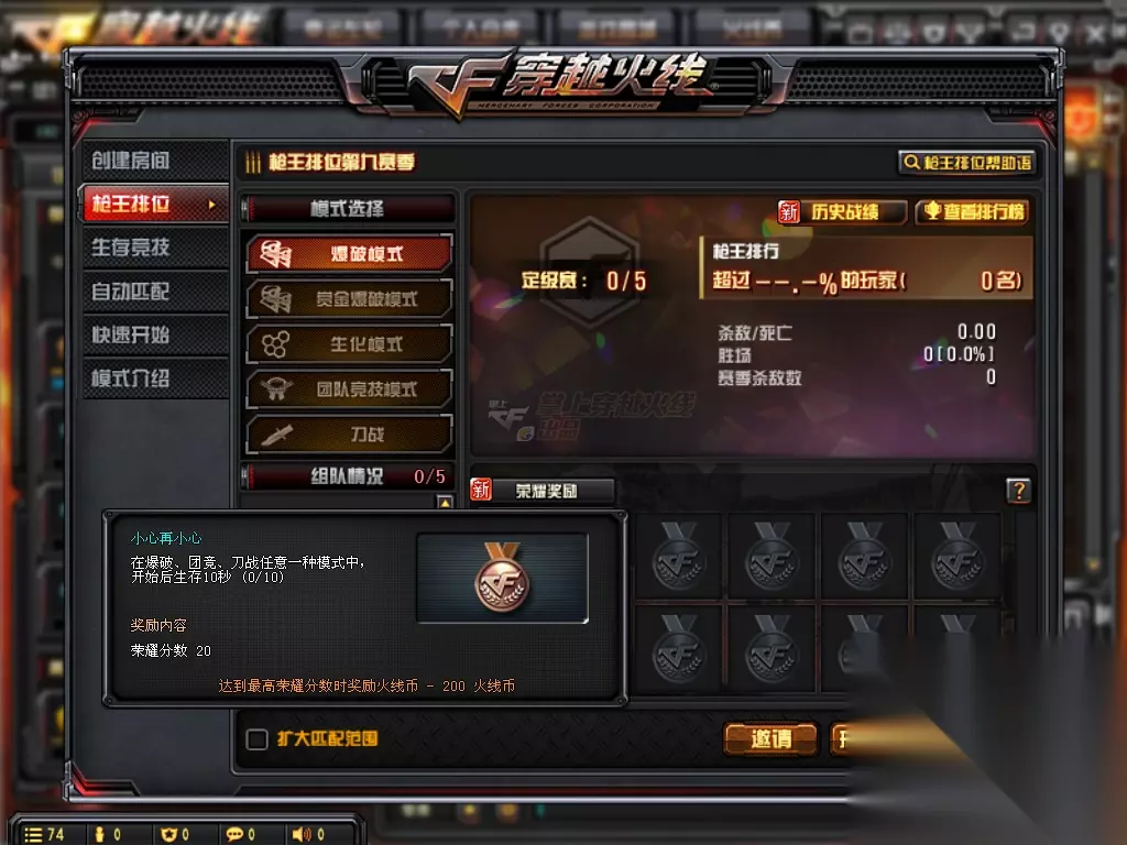 胜利属于我:在爆破、团竞、刀战中累计胜利次数达到10次(0/10)奖励内容:荣誉分数70,达到最高荣誉分数时奖励火线币-400火线币 来热热身?:挑战一次排位赛(0/1)奖励内容:荣耀分数20,达到最高荣耀分数时奖励火线币-200火线币 小心再小心:在爆破、团竞、刀战任意一种模式中,开始后生存10秒(0/10)奖励内容:荣耀分数20,达到最高荣誉分数时奖励火线币-200火线币 给点颜色:累计伤害达到200(0/2)奖励内容:荣耀分数20,达到最高荣耀分数时奖励火线币-200火线币 结语