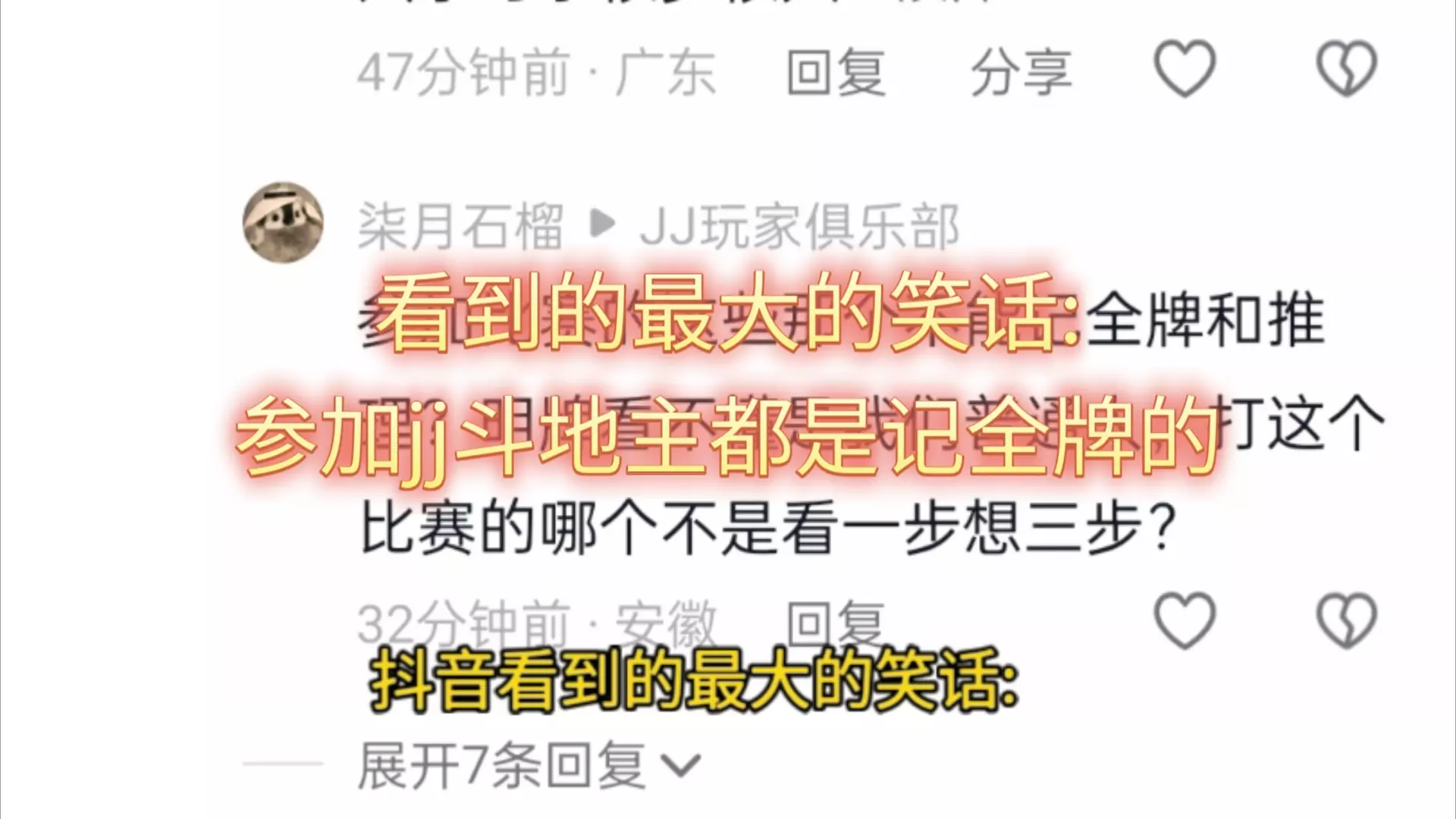 看到的最大的笑话:参加jj斗地主都是记全牌的,这是从没看过比赛?比赛各种反向名人名场面,很多人打了很久,还是菜,成绩也不行。比赛还是分弱队强队,选手还是分高手菜…