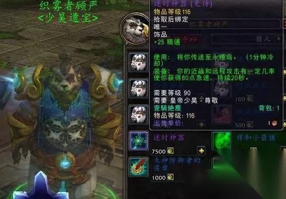 4、传送到翡翠林以后,召唤出自己的飞行坐骑,直接飞到永恒岛,潘达利亚的飞行,现在是直接解锁,无需要再学习四风的智慧。 5、到了永恒岛以后,可以解锁各自阵营的飞行点,以后可以使用公共飞行坐骑。 6、当然,最好的办法是把皇帝少昊的声望提升到尊敬以后,找织雾者顾严购买一个“迷时神器”,以后就可以直接传送到永恒岛了。