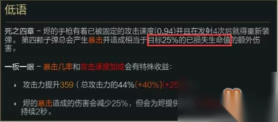 除了叠加起来轻松以外,黑暗收割烬还有一个最大的特点,那就是和烬的输出方式非常契合,烬可以使用前三枪以及QW去把敌人的血量压低至50%以下,然后捏着第四下的暴击平A,带着黑暗收割的效果往前走,这一枪下去伤害瞬间爆炸,第四枪的低语会造成给予敌人已损失的25%生命值来计算伤害,再加上黑暗收割的伤害,这一枪下去,脆皮会被直接击杀,根本活不了。