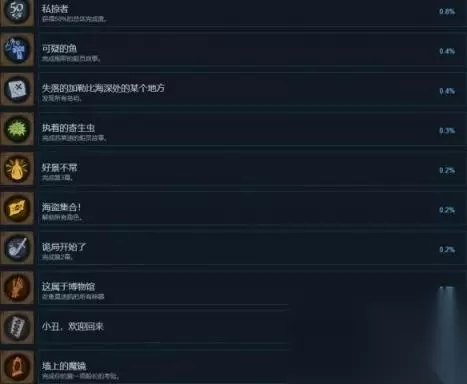 私掠者 解锁条件:获得50%的总体完成度。 可疑的鱼 解锁条件:完成桐耶的船员故事。 失落的加勒比海深处的某个地方 解锁条件:发现所有岛屿。 执着的寄生虫 解锁条件:完成苏莱迪的船员故事。 好景不常 解锁条件:完成第3幕。 海盗集合! 解锁条件:解锁所有角色。 诡局开始了 解锁条件:完成第2幕。 这属于博物馆 解锁条件:收集莫迪凯的所有神器 墙上的魔镜 解锁条件:完成你的第一项船长的考验。 全副武装 解锁条件:解锁所有技能升级。