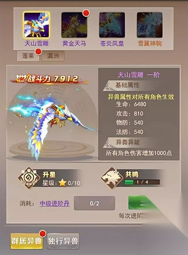 异兽可以通过升星和升阶来获得属性的提升,升星需要消耗材料升星石(可通过新增的材料副本-升星石副本获得),进阶可以提高异兽升星的上限。异兽进阶需要消耗与异兽同品质的进阶丹,进阶丹可以通过商城购买或者使用升星石炼制得到。这两者属性的提高,都能为玩家大大增加战力。