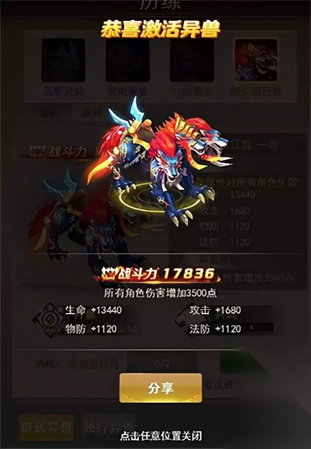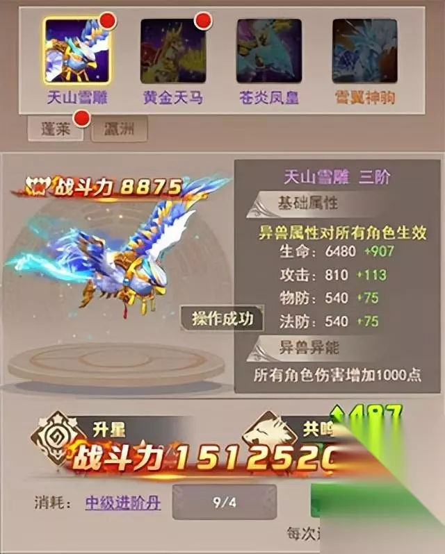 在现阶段,已经开放的8只异兽,都是能相对简单地获得的。其中蓬莱最顶级的异兽“雪翼神驹”现在正在低折抢购中。而另外三只异兽,则在通关修仙之路20、200以及800层后获得,已经通关的仙友需要进入界面噢,左方会有免费领取的窗口闪动,点击即可。这四只来自蓬莱的异兽是非常容易获得的,一旦集齐,即可开启“异兽共鸣”效果,可增加大量属性,获得一个特殊技能效果。