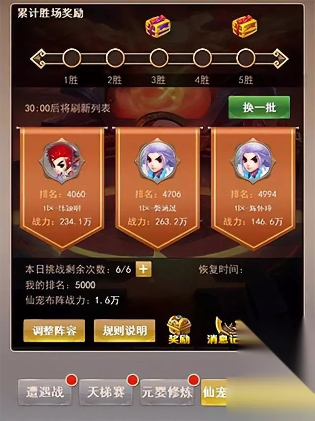 值得一提的是,作为进攻方我们是可以看到你选择的对手的仙宠、排位和技能的。这就是一个机会,让你通过制造出克制对手的布局去战胜对手!这可是战力与策略的最高挑战!用我们最爱的仙宠,去迎接最强大的对手,若胜利了那份满足感可是无可比拟的!这就是让人又爱又恨的仙宠竞技场!不过注意每天只能挑战6次仙宠竞技噢,若想继续需要通过购买次数实现。