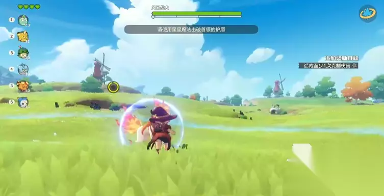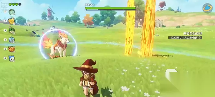 我们抵达风暴战犬处,打开星星魔法对其攻击后,场地的蓝圈生成挑战也正式开始,在第1阶段的挑战过程中,敌人会释放出三种技能,第一个技能会化身为火球,向着角色的位置冲过来。