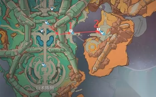 1、传送至衍术阵列北边的第二个传送锚点(图中),往后看,从视角左侧的门洞走