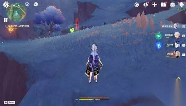 2、同样传送到上图的传送锚点,朝东南方向走,爬上前面的坡,可以看见下一个破顶有一个限时挑战,坡脚还有一个匿叶龙的印记,完成挑战获得一个精致的宝箱 挑战内容:在60秒内击败所有敌人 (附身匿叶龙用火榴果炸就行)