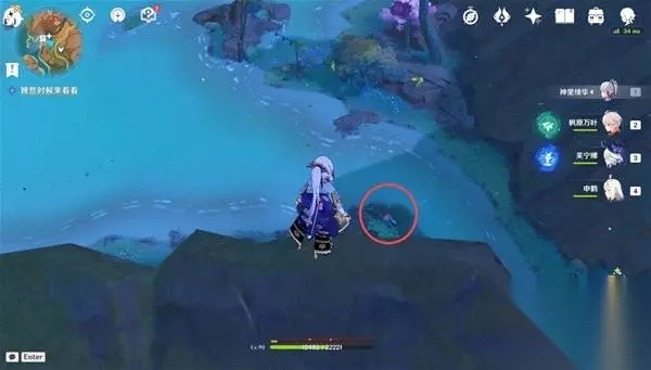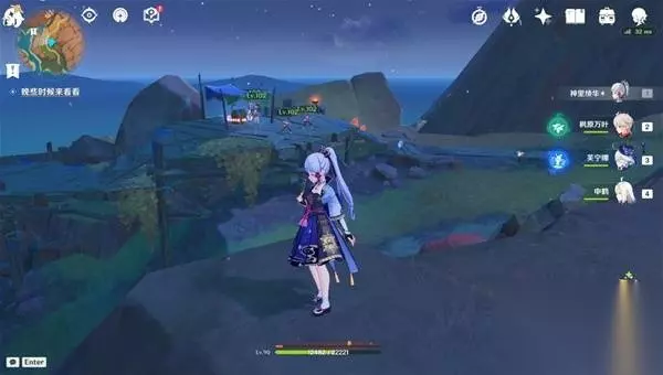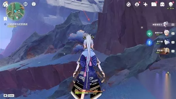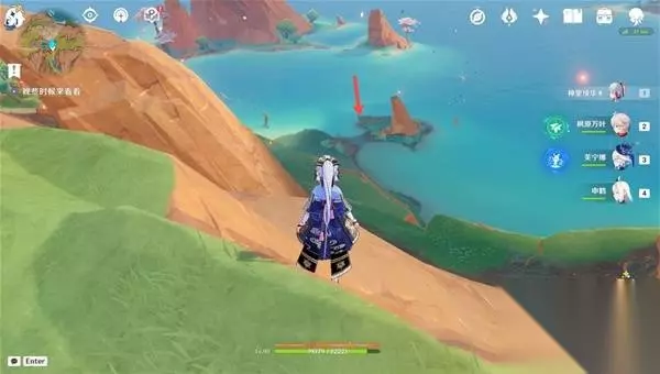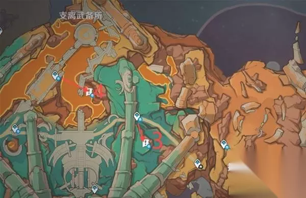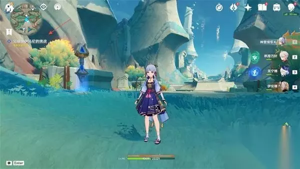 3、传送至支离武备所东南的传送锚点(图中),爬上南边的山坡就可以看见一个限时挑战,完成挑战获得一个普通的宝箱 挑战内容:在60秒内击败所有敌人 (附身匿叶龙用火药桶炸就行)