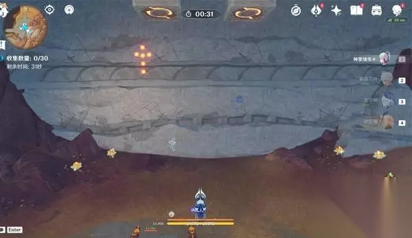 3、传送到BOSS东南的传送锚点,视角转向西面就可以看见一个限时挑战,完成挑战获得一个精致的宝箱 挑战内容:在40秒内收集21个火之微粒