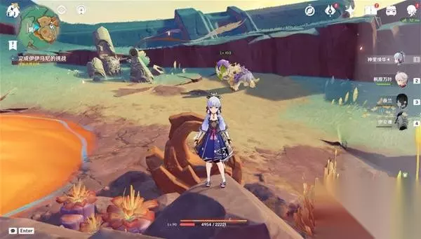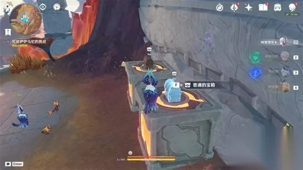 6、传送到火山西南边的地面传送锚点,朝西北方向走,可以看见水边有一个限时挑战,完成挑战获得一个普通的宝箱 挑战内容:在40秒内收集20个火之微粒 (注意提前附身匿叶龙)