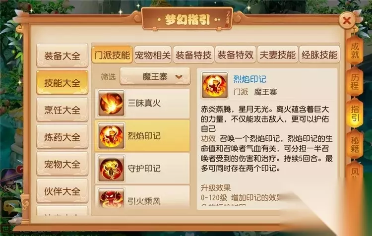 烈焰印记能够获得一个护盾,一千四百五法术伤害能够生成一千一百五左右的护盾。烈焰印记在正常回合结束,有概率能够释放飞沙走石或三昧真火。一千四百五法术伤害对八百五法术防御的目标,烈焰印记、飞沙走石对每个单位能够造成二百五到三百三左右的伤害。烈焰印记、三昧真火对随机目标能够造成四百二到六百三左右的伤害。魔王寨拥有两个印记后,可以消耗掉两个印记召唤先祖印记。