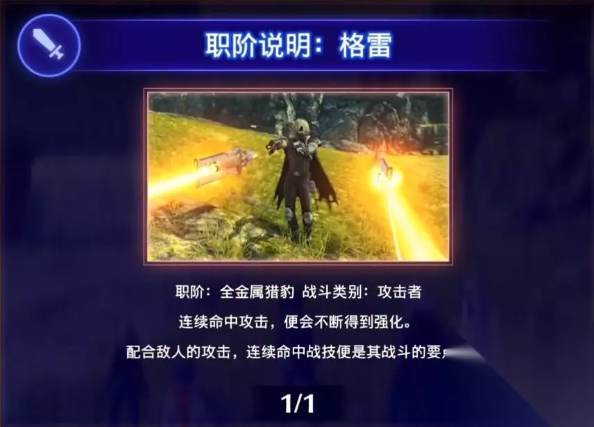 格雷的职阶为全金属猎豹,类别为攻击者。连续命中攻击,便会不断得到强化。配合敌人的攻击,连续命中战技便是其战斗的要点。