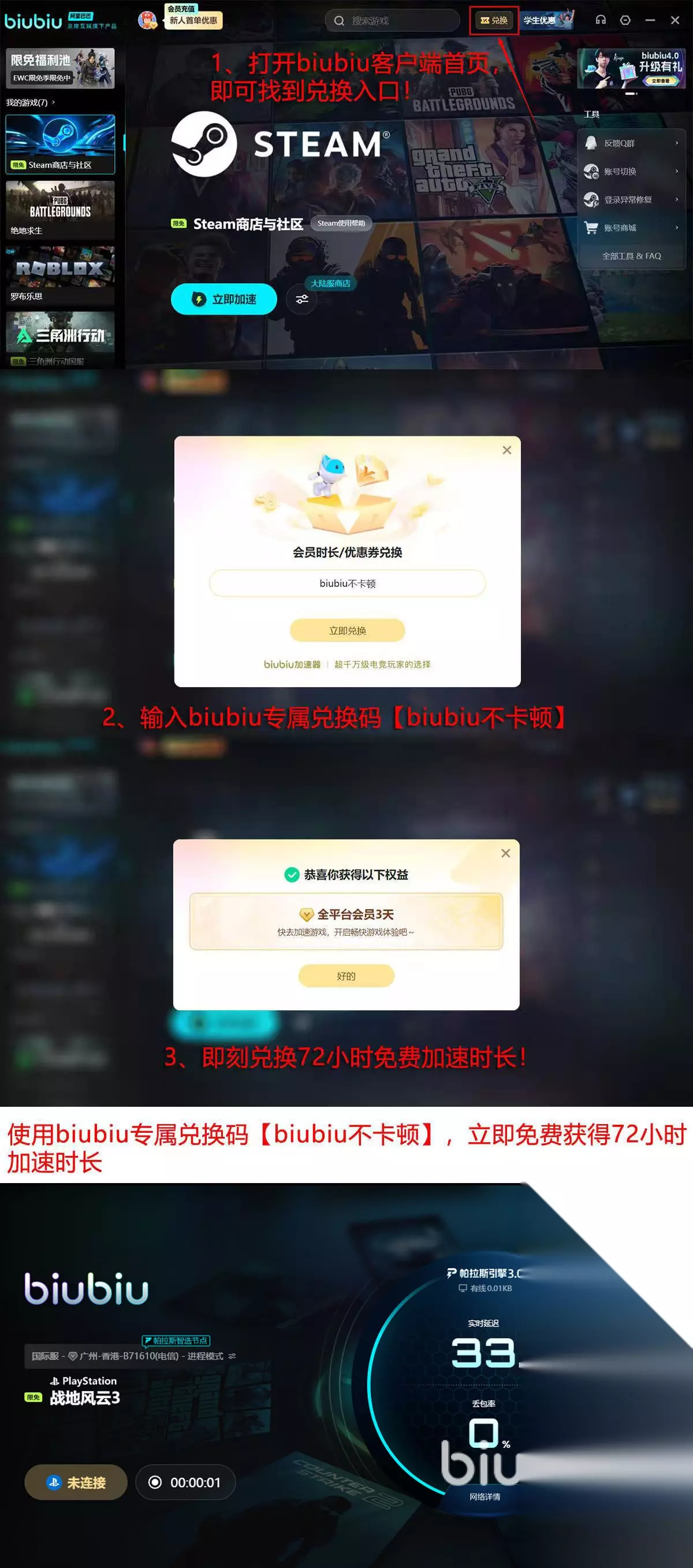 经过biubiu加速器提速和优化后的网络,无论是不是国际服游戏,都能得到极大地提升,并且整体的流畅度也能得到保障,如果想要体验加速效果,biubiu还开展的无成本的体验活动,之前如果没有注册过账号,现在注册后就能立刻得到24小时免费加速时长,同时还能参与老会员才可参与的口令福利领取活动,即用口令【biubiu不卡顿】在首页上直接兑换72小时的加速福利,新人用户实际能领取到96小时福利,而且在所有福利时间内,整个平台上的所有游戏都可以加速。