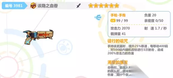 崩坏学园2该隐之血眷是一把六星的手炮武器,它的载弹量和输出都不低,是很值得玩家拥有的武器。角色持有武器的时候移动速度也会上升。