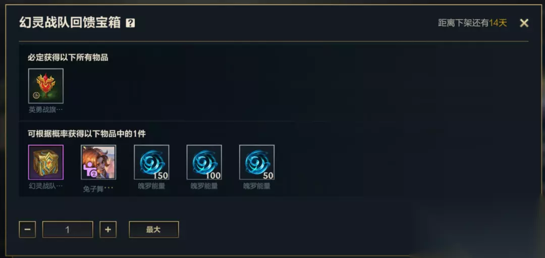 开启宝箱将有机会获得幻灵战队回馈自选宝箱,召唤师可选择跳跳倩影 厄运小姐 回馈礼包、喵喵魅影 金克丝 回馈礼包或魄罗王天选随机皮肤宝箱获取奖励!
