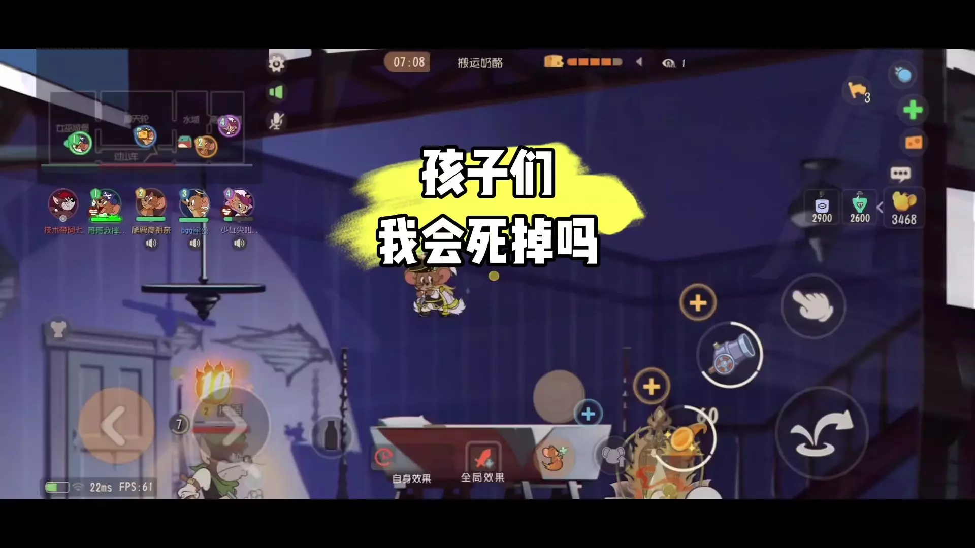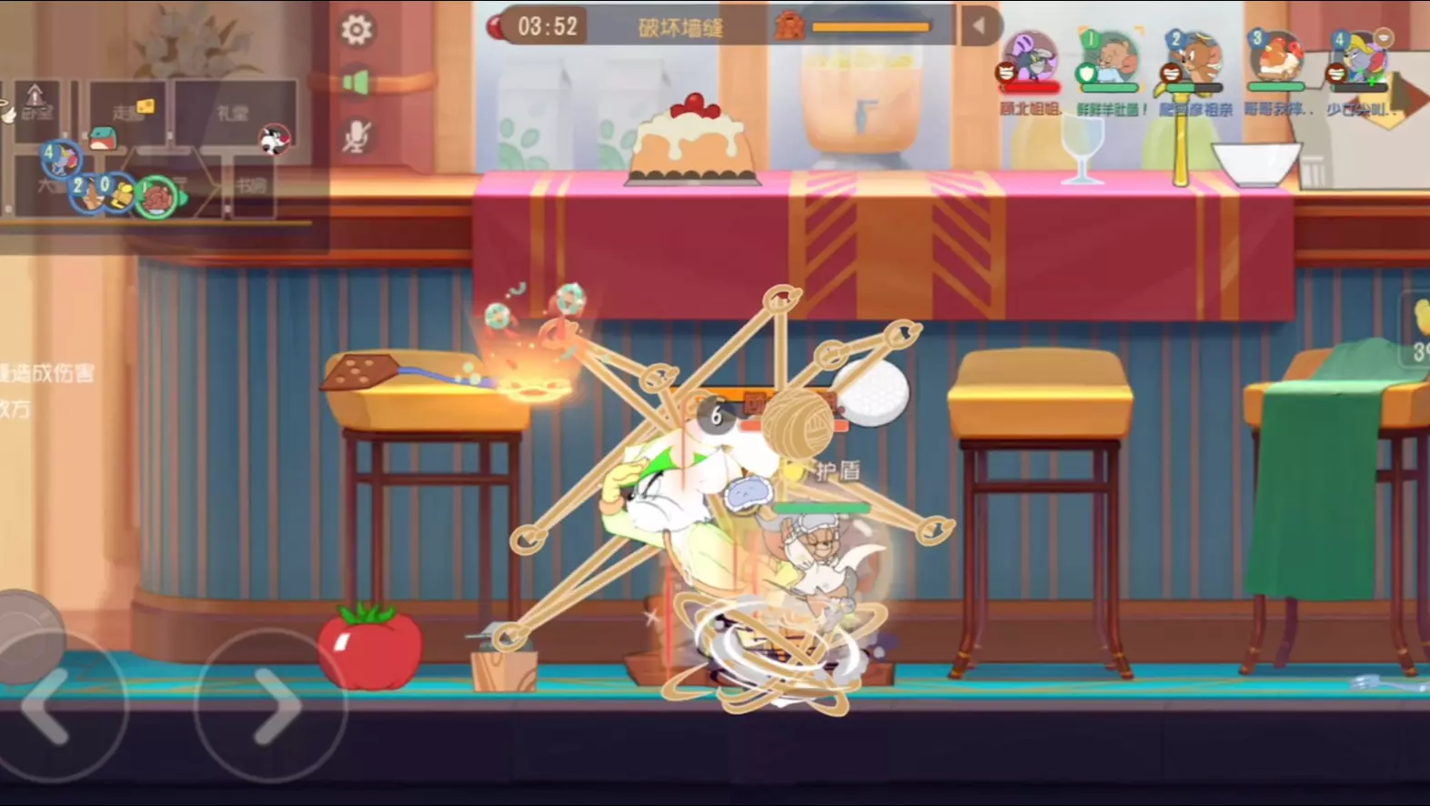 这是《猫和老鼠手游》的对局内容,玩家操控老鼠角色,在破坏墙缝的对局阶段,和队友配合,运用技能与道具和猫展开对抗,还尝试营救被绑上火箭的队友,展现了游戏里的趣味对战过程。