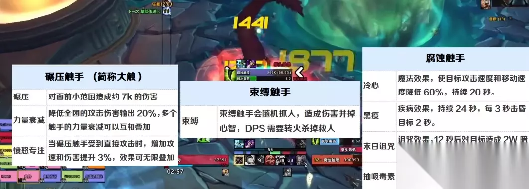 第二阶段BOSS在中间露出身体,不过还是无敌状态,场地上会围着BOSS刷新三种触手,分别是碾压触手、束缚触手、腐蚀触手。同时呢BOSS会放三个新技能,一技能意识连接随机连线两个玩家,被点名的人必须要站在10码以内,否则会持续掉血和心智。第二扭曲心灵跟术士的死缠效果一样啊,造成伤害并降低心智同时使玩家恐惧4秒,注意该效果结束以后会传染给4码内的另一个玩家,所有人务必远离中这个死缠的玩家。第三激光扫射,BOSS会引导4条随机的绿色,激光术缓慢移动,千万不要被打中,否则直接秒杀。