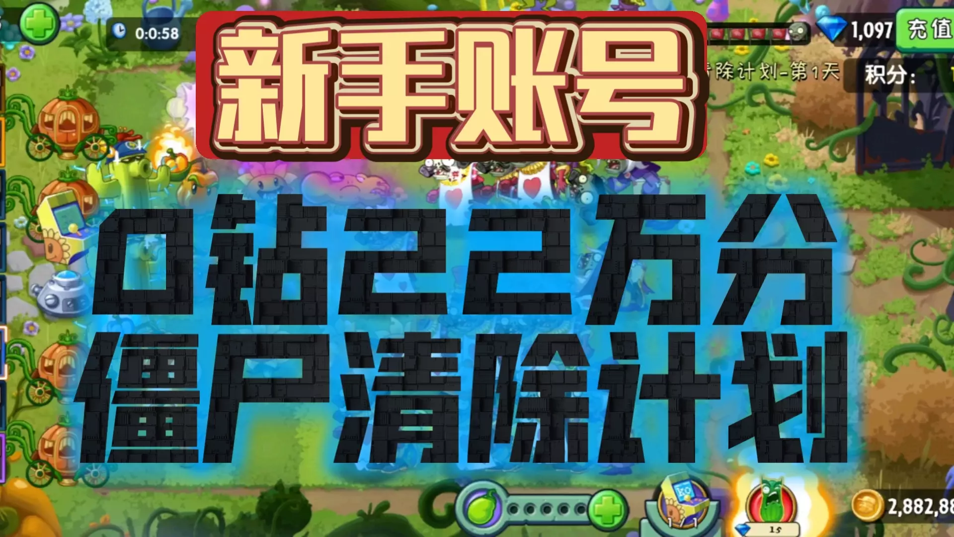 这里分享植物大战僵尸2紫手套搭配下,僵尸清除计划第一天的战斗过程,展示了使用机枪豌豆等植物对阵多阶僵尸的战斗场景