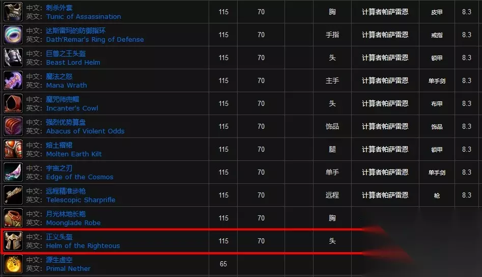 玩家在能源舰副本中击杀boss计算者帕萨雷恩时,有8.3%的概率会掉落正义头盔。