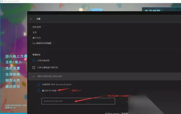 辐射3年度版epic中文设置教程 从Epic客户端的左下角选择设置 然后下拉到最下面、找到辐射3年度版然后把额外命令行打上√ 输入-culture=zh-Hans-CN这个代码就是中文了。 以上就是辐射3年度版epic中文设置教程的全部内容,想要了解最新游戏资讯和攻略的玩家们可不要错过了哦!