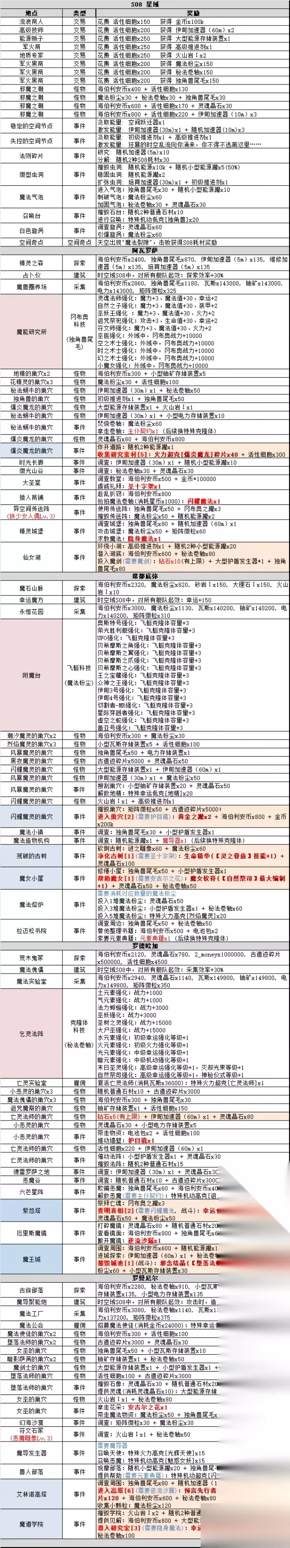 不思议迷宫时空域S08攻略大全 1、建筑升级 推荐顺序:中枢Lv.3 → 矩阵武器库 → 商店Lv.1 → 铁少女人偶Lv.3 → 恶魔雕像Lv.3 → 其它 星球中枢:主星核心建筑 风之图腾:时空域S08,舰队能力提升:舰队机动+30/60/90 铁少女人偶:时空域S08,舰队能力提升:第1轮攻击时,伤害提升2/4/6%Lv.3解锁小行星特殊事件【异空间传送阵】 恶魔雕像:时空域S08,舰队能力提升:舰队探索效率+10/20/30%Lv.3解锁小行星特殊事件【符文石冢】 魔法守卫:时空域S08,舰队能力提升:受创时,提升10/20/30点火力 商店:使用S08星币购买商品 科研所:天空中,所有阵营秘宝伤害+5% 元素提炼厂-α/β/γ:提交 灵魂晶石 转换为 联盟币、能源 和 元素石*元素石为S08【科研所】启动材料 矩阵武器库:建造和升级S08矩阵武器*在完成S08全部科技拷贝后,可将S08科技耗材转换为矩阵微粒 2、完整事件