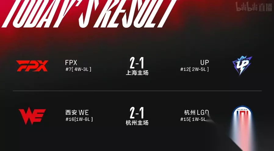 【昨日战报】 FPX 2:1 UP WE 2:1 LGD 在FPX和UP的比赛中,两队鏖战三场,FPX凭借出色的节奏和团战配合,在第三局获得巨大优势赢得最终胜利。而WE在今天的比赛中,也是艰难的2-1击败了LGD,收获了久违的胜利。