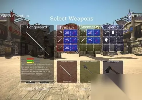 游戏开始,除了选择阵营,还可以选择四个兵种弓箭手,刀斧手,重装骑士,剑士中的任意一种,每个兵种都有自己的特征,并且可以选择主武器,副手武器,以及特殊武器,在游戏进行时可以使用1,2,3,4进行切换,特殊武器基本为投掷的手斧,飞镖,甚至燃烧弹,但普遍辅助作用大于伤害效果。