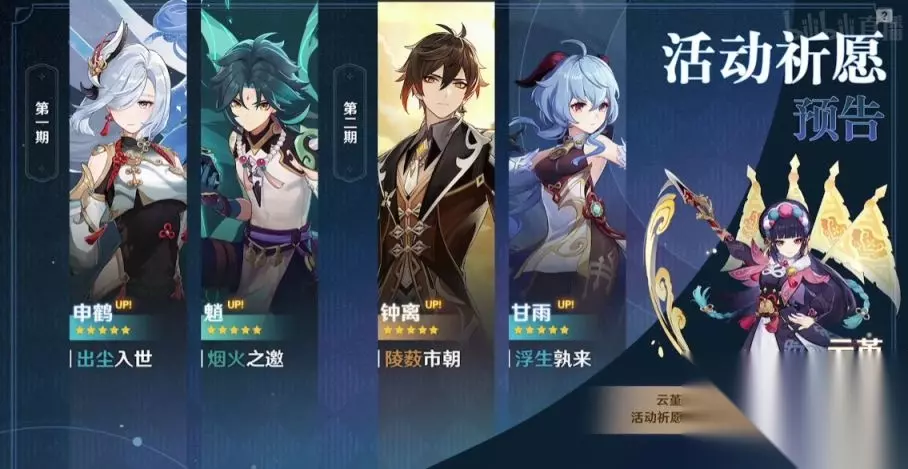 原神2.4角色up池角色一览。原神2.4版本就要来了,在1月5号就会上线,很多小伙伴不知道这一个版本的UP卡池会复刻哪些5星角色,很多小伙伴知道会有申鹤,但是不知道其他三个,那么下面就一起来看看吧。 原神2.4角色up池角色一览 第一期 出尘入世 I 申鹤 up 、烟火之邀 I 魈 up (4★云堇,在魈和申鹤的up池里) 第二期 陵薮市朝 I 钟离 up 、浮生孰来 I 甘雨 up 降魔大圣——「魈」,快乐风男,无敌打桩机,璃月3c之一。 岩王帝君——「钟离」,一盾在身,不动如山,套盾减抗,七神之一。 循循守月——「甘雨」,月海亭秘书,半仙之体,璃月3c之一。 新角色——「申鹤」,必备连体黑丝。