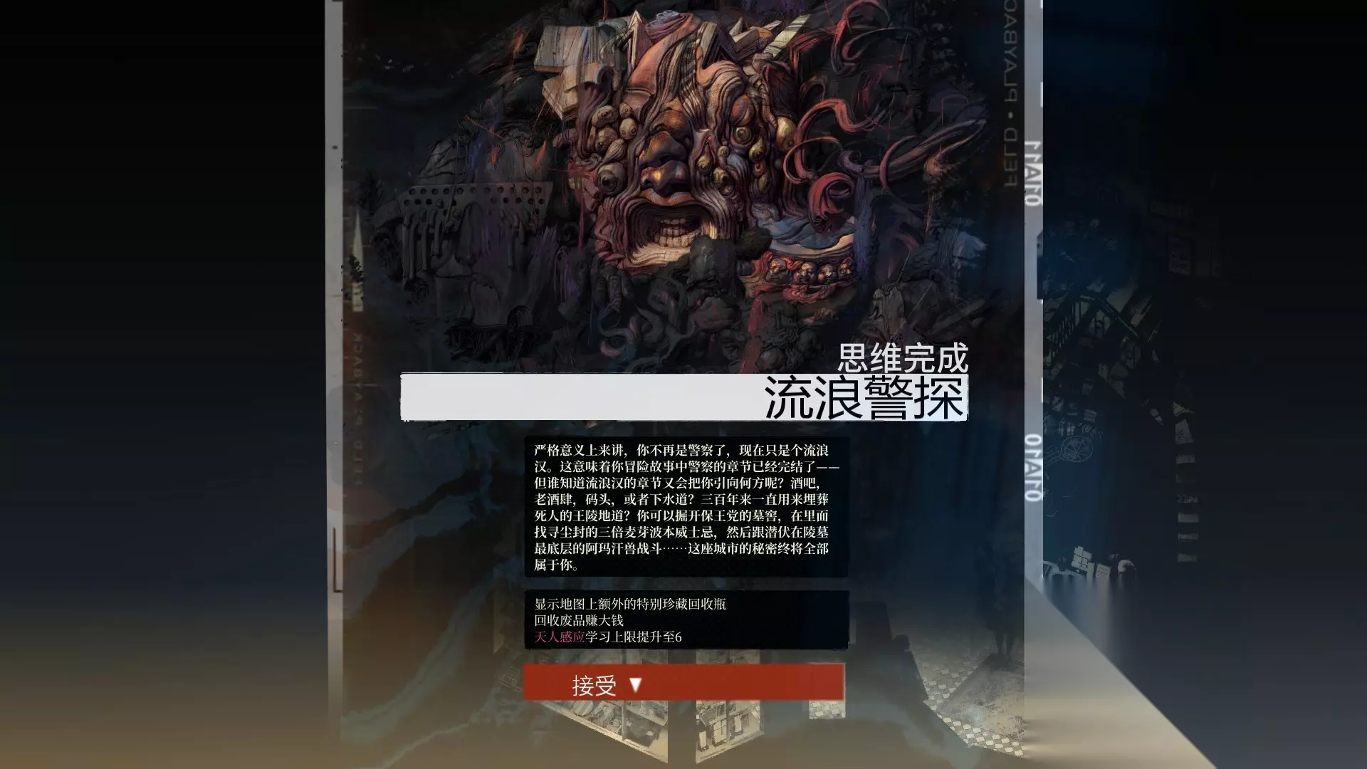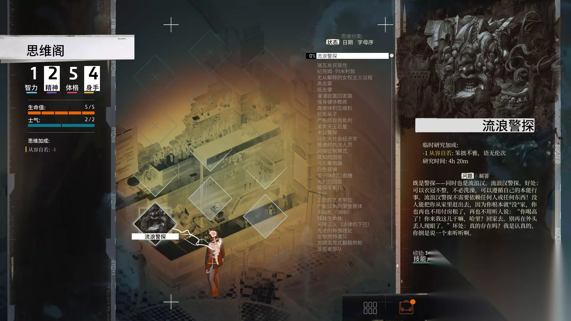 之后会跳出思维”流浪警探“,这个思维需要四小时二十分钟的游戏内时间来完成内在化。